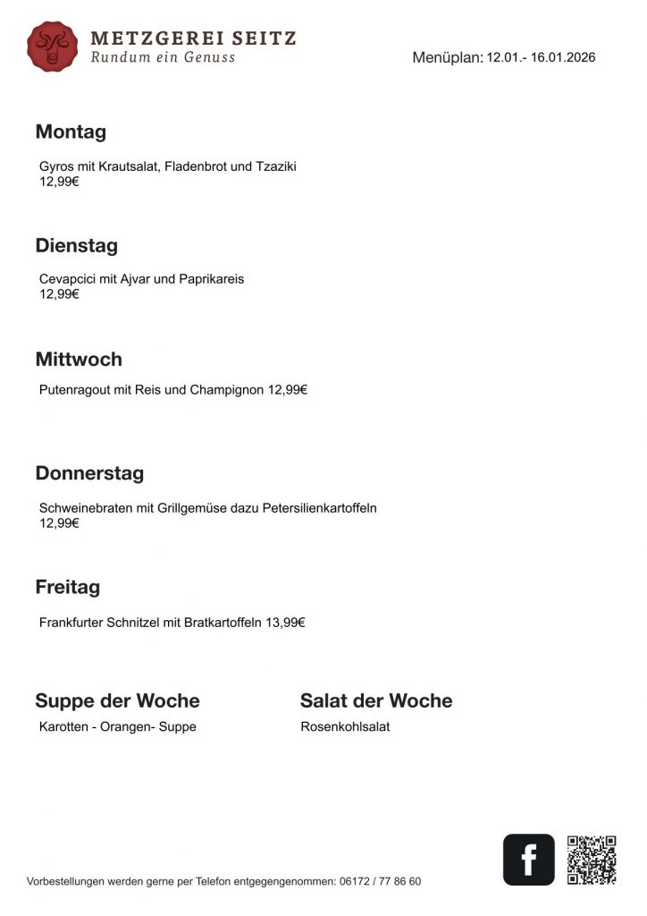 Liebe Kundinnen und Kunden unserer Metzgerei, hinter uns liegen ereignisreiche Wochen und ein turbulentes Weihnachtsgeschäft. Damit wir Ihnen auch im neuen Jahr wieder mit voller Leidenschaft und frischen Spezialitäten zur Seite stehen können, gönnen wir uns und unserem Team eine kleine Auszeit. Unsere Metzgerei bleibt wegen Betriebsferien vom 05.01. bis einschließlich 10.01. geschlossen. Ab Montag, den 12.01.2026, sind wir wieder wie gewohnt für Sie da und freuen uns darauf, Sie mit gewohnter Frische und Qualität bei uns im Laden zu begrüßen. Vielen Dank für Ihr Verständnis und Ihre Treue! Herzliche Grüße, Ihr Thomas Seitz und das gesamte Team